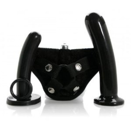 The harness is adjustable at the leg and the waist, and fits a wide range of sizes. It's machine washable and comes with two interchangeable rubber O rings, which will accommodate dills of larger dimensions, as you work your way through different levels of comfort. The vibe is just ok. If you really want to make this harness sing, try pairing it with a Tango from We Vibe.