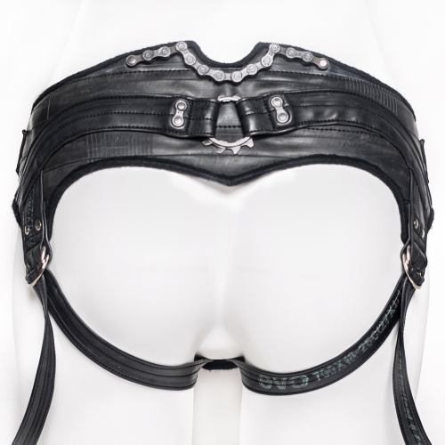 Oxyd Creations' sexy, vegan strap-on harness is carefully handcrafted in Montreal from recycled bike tubes. It is lined with black polyester felt, which overlaps onto the front so the edges are all soft. The back of the harness is decorated with recycled bike chain and a gear. The harness can be adjusted to fit hips measuring 28" to 53" - there are adjustment rings in the front and back, through which you pull the tube straps to tighten.